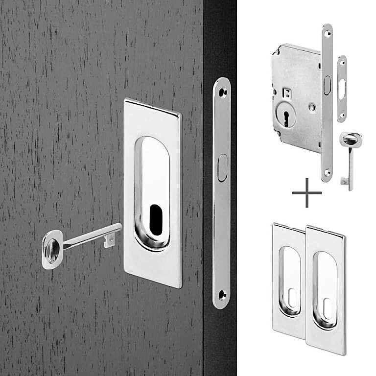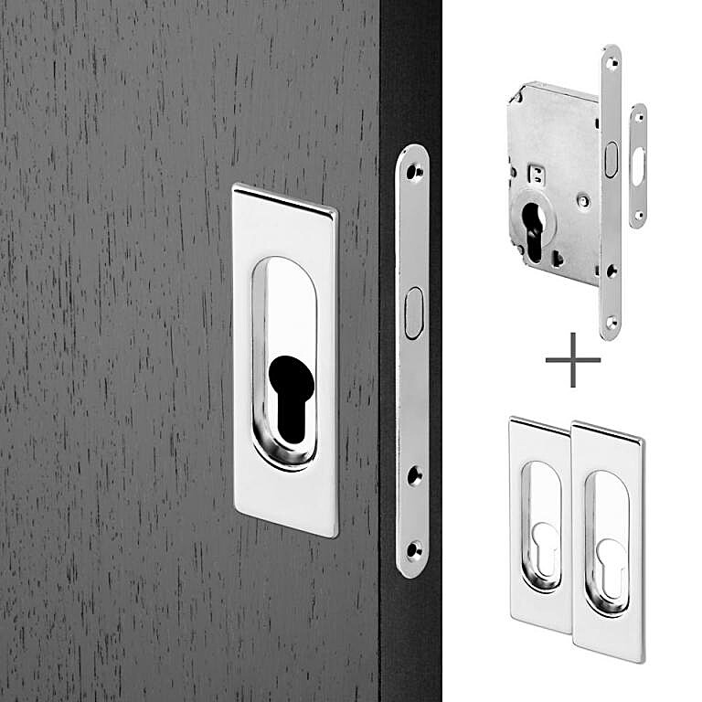 Výhodná sada dvou úchytů a zadlabacího zámku pro posuvné dveře. Dostupné v široké škále barevných provedení. Varianty s WC kličkou, obyčejným klíčem nebo stavební vložkou - fabkou.
