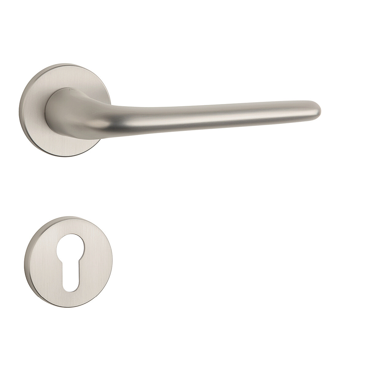 Rozetová klika na interiérové dveře s kulatou rozetou je vyrobena z materiálů vysoké kvality - zamak a je povrchově upravena. Rozeta má průměr 52 mm a tloušťku jen 7 mm. Minimalistický design rozety s vysokou stabilitou kliky na dveřích působí jemně, a tím ponechává prostor pro vyniknutí designu samotné kliky.