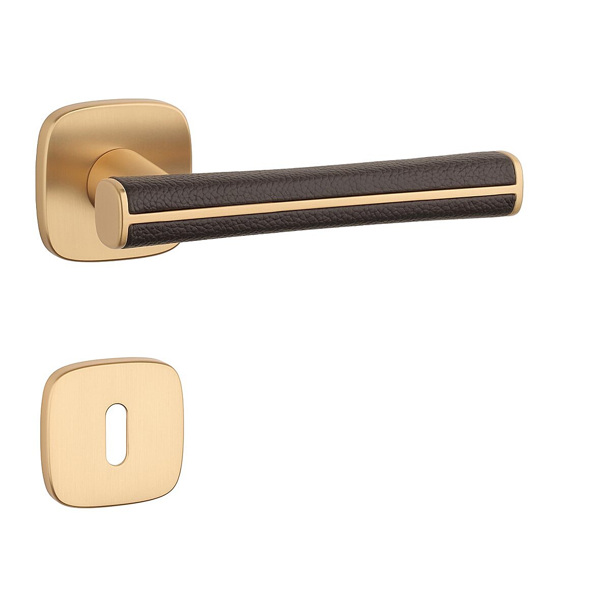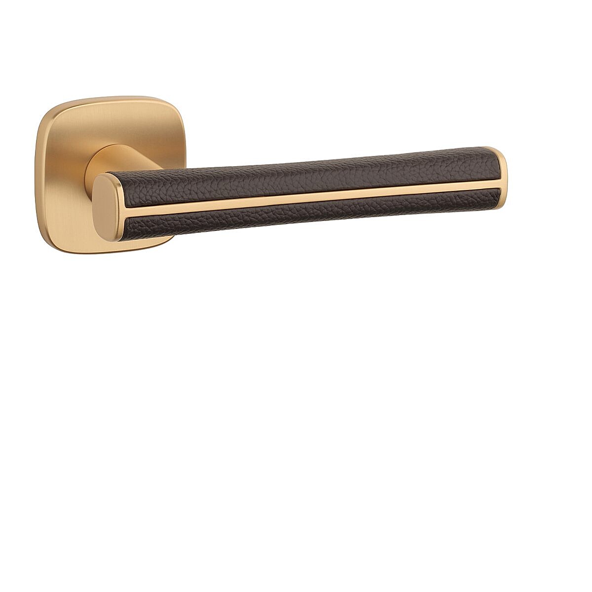 Rozetová klika na interiérové dveře s hranatou oblou rozetou je vyrobená z materiálů vysoké kvality - zamak a je povrchově upravená. Speciální efekt vytváří hnědá kůže, která obepíná rukojeť kliky.