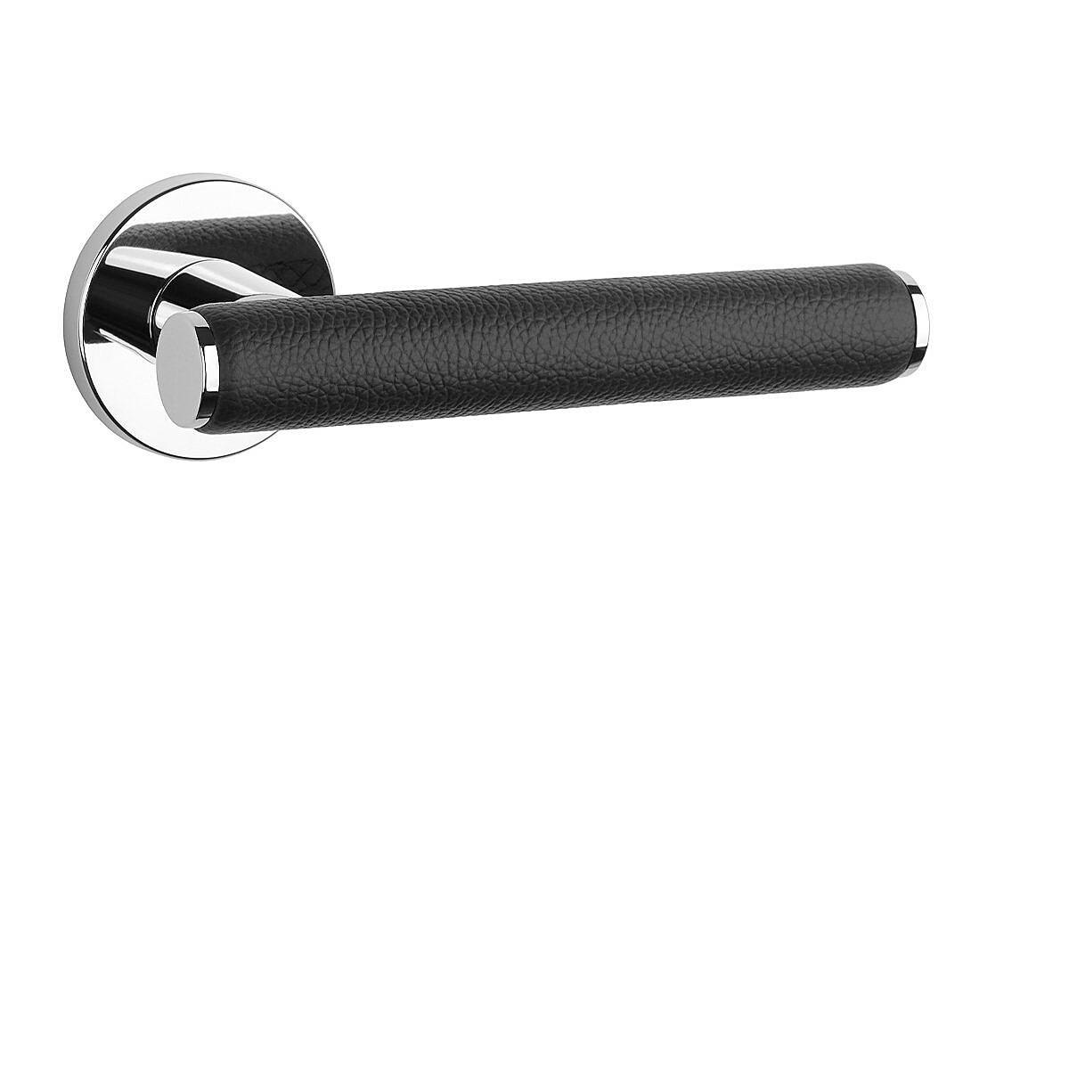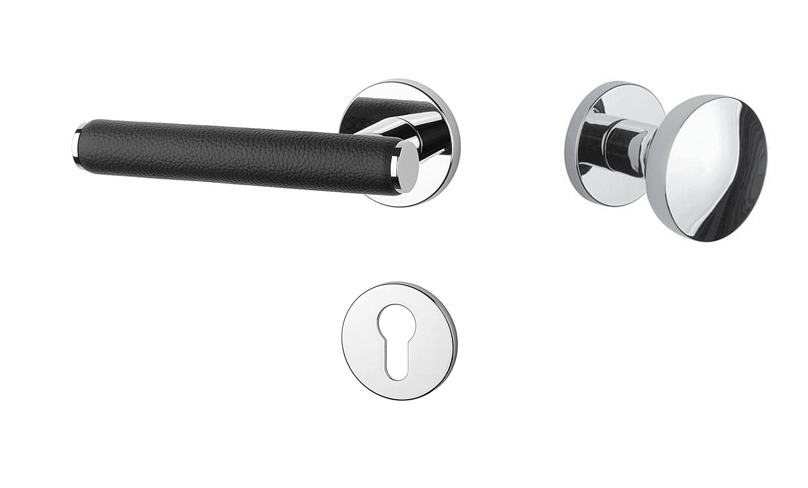 Rozetová klika na interiérové dveře s kulatou rozetou je vyrobena z materiálů vysoké kvality - zamak a je povrchově upravena. Zajímavým prvkem je černá kůže, která obepíná rukojeť kliky.