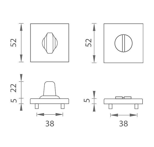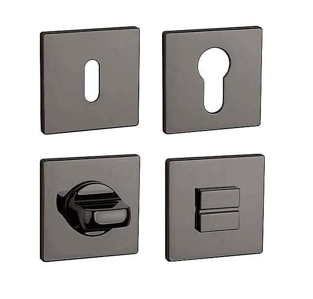 Rozeta má rozměr 52x52 mm, tloušťku 5 mm a oválný otvor pro interiérový klíč (BB), otvor pro cylindrickou vložku (PZ), WC set s vmontovaným klíčem.