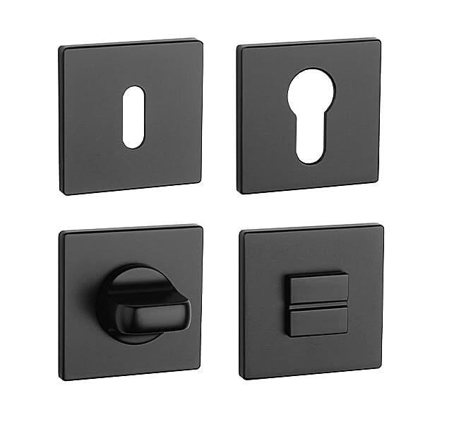 Rozeta má rozměr 52x52 mm, tloušťku 5 mm a oválný otvor pro interiérový klíč (BB), otvor pro cylindrickou vložku (PZ), WC set s vmontovaným klíčem.