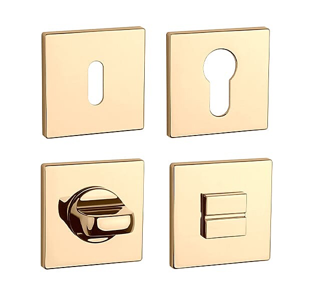 Rozeta má rozměr 52x52 mm, tloušťku 5 mm a oválný otvor pro interiérový klíč (BB), otvor pro cylindrickou vložku (PZ), WC set s vmontovaným klíčem.