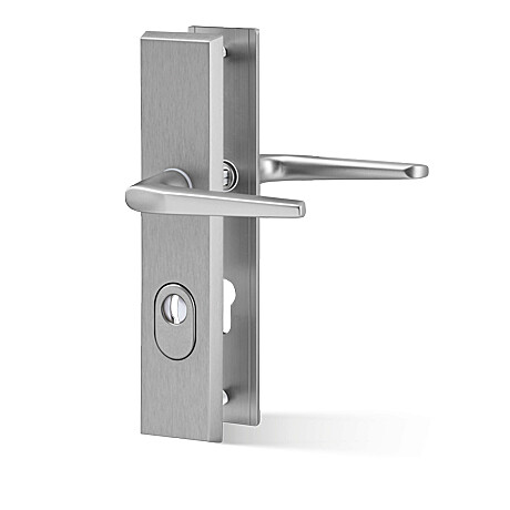 Bezpečtnostní kování vhodné pro vchodové dveře s certifikátem bezpečnosti RC3 odpovídající ČSN ENV 1627:2012. Od základního modelu se liší ve své konstrukci stavitelnou překrytou otvoru pro vložku, která brání odvrtání a vylomení vložky. (Klika Monte)