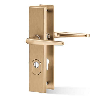 Bezpečtnostní kování vhodné pro vchodové dveře s certifikátem bezpečnosti RC3 odpovídající ČSN ENV 1627:2012. Od základního modelu se liší ve své konstrukci stavitelnou překrytou otvoru pro vložku, která brání odvrtání a vylomení vložky. (Klika Monte)