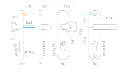 Hliníkové certifikované bezpečnostní kování pro vstupní vchodové dveře.