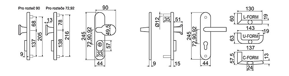 | Rozteč | 72 mm, 90 mm, 92 mm |