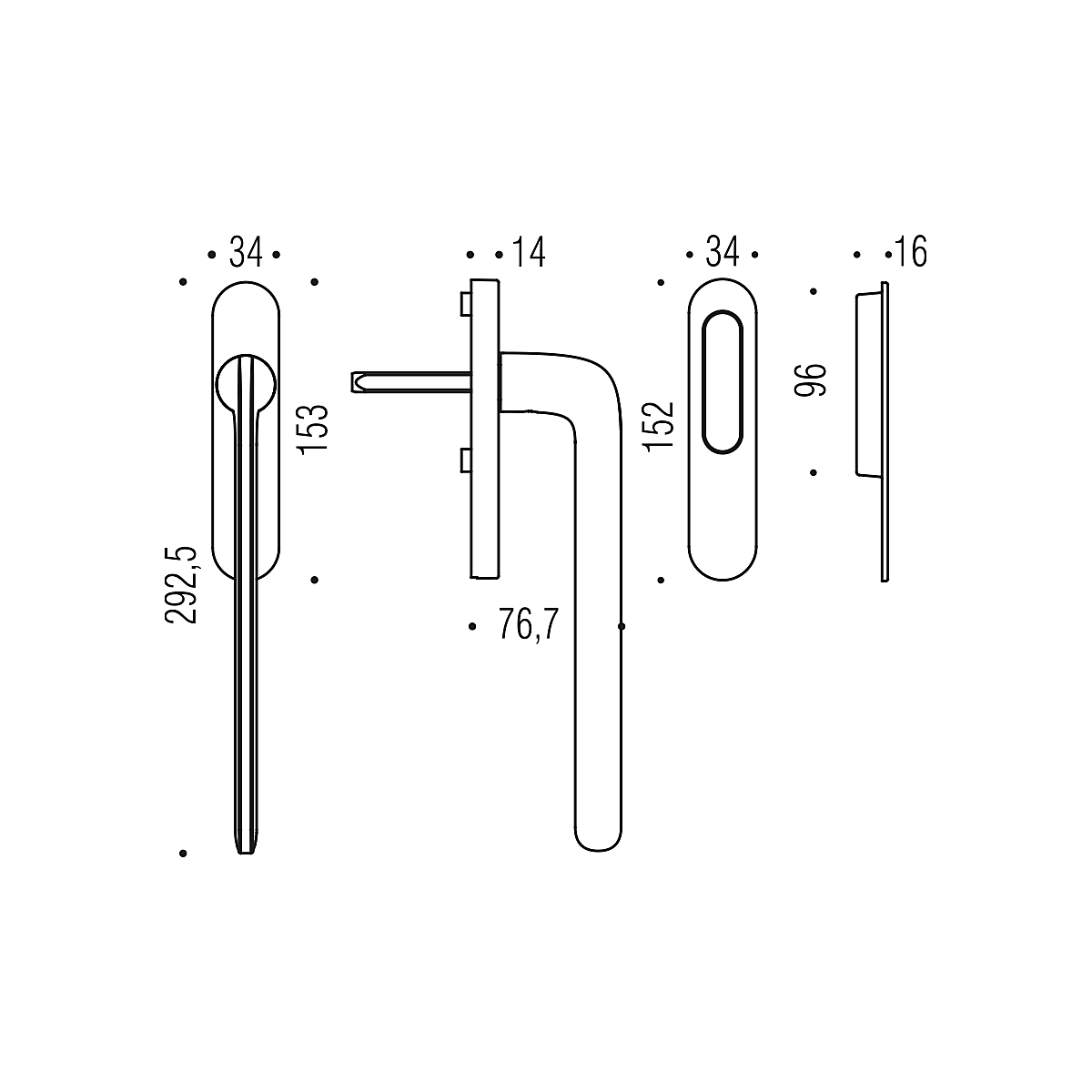 Oválná rozeta má rozměry 34 mm x 153 mm a tloušťku 14 mm.