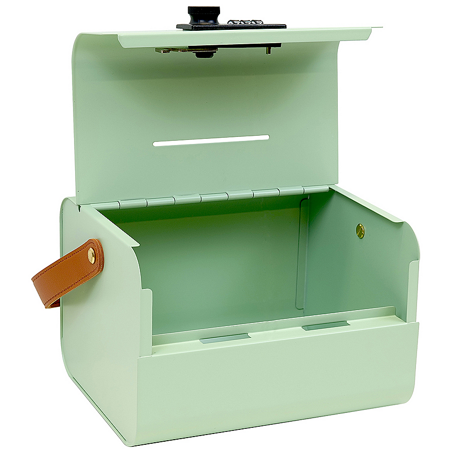 Ocelová pokladnička s kódovým zámkem a koženkovým popruhem