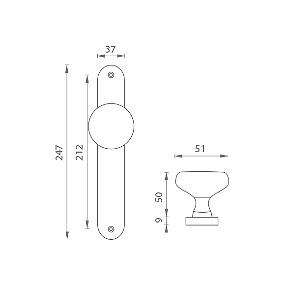 Dveřní pevná přímá koule na oválném štítě je vyrobena z materiálů vysoké kvality - mosaz a je povrchově upravena. Koule má průměr 51 mm a štít má rozměry 37 mm x 247 mm.