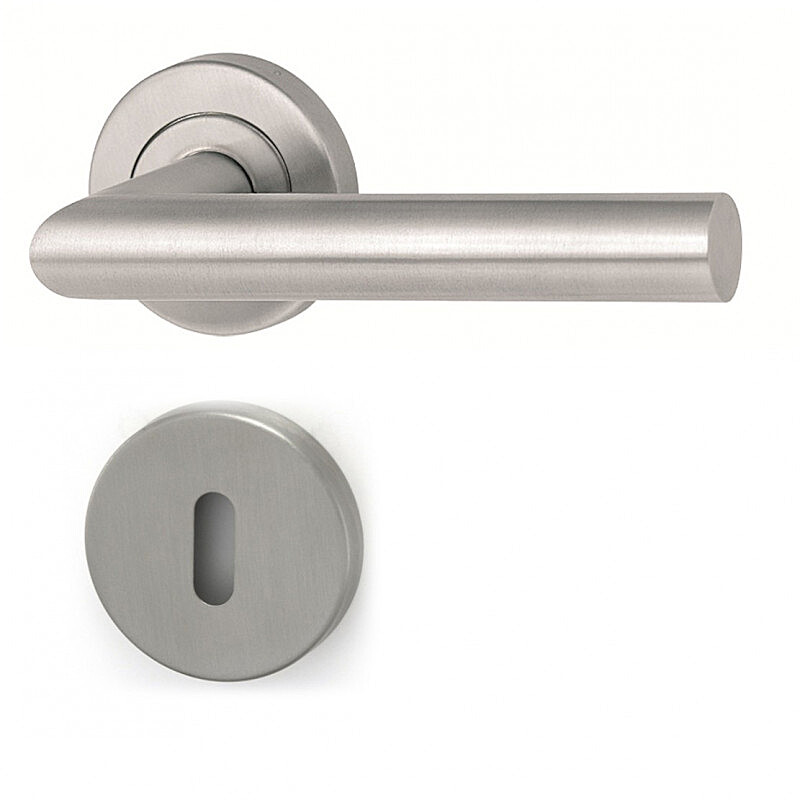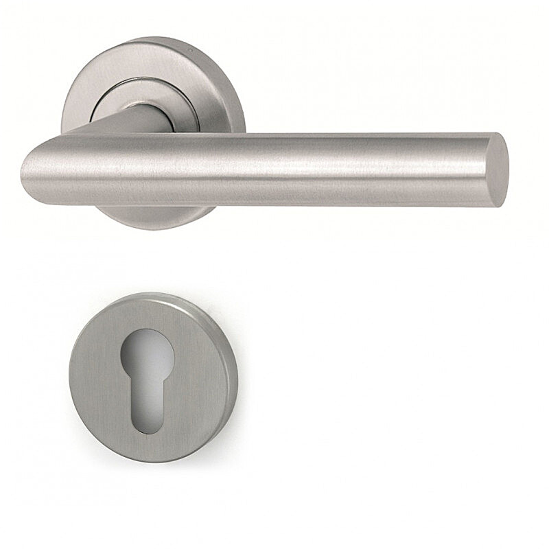 Dveřní klika MT 00 s kulatou, hranatou nebo oválnou rozetou je vhodná k instalaci do interiéru i exteriéru, vyrobená z nerezové oceli DIN 1.4301 se satinovaným matným povrchem s moderním a nadčasovým designem, hygienicky nezávadná, s dlouhou životností.