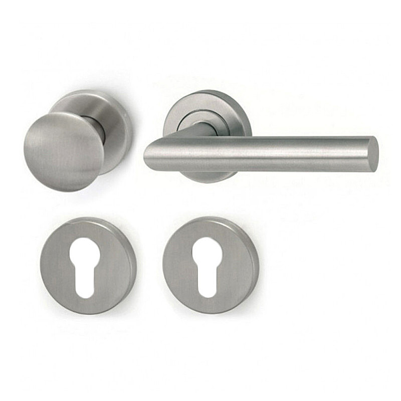 Dveřní klika MT 00 s kulatou, hranatou nebo oválnou rozetou je vhodná k instalaci do interiéru i exteriéru, vyrobená z nerezové oceli DIN 1.4301 se satinovaným matným povrchem s moderním a nadčasovým designem, hygienicky nezávadná, s dlouhou životností.