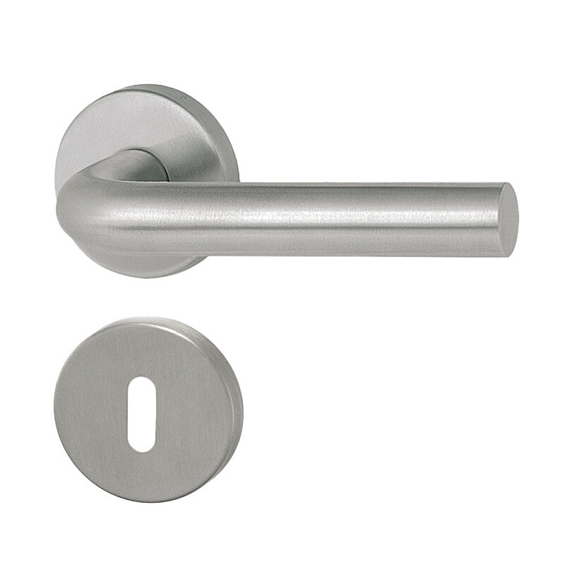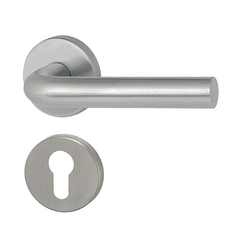 Dveřní klika MT 01 s kulatou, hranatou nebo oválnou rozetou je vhodná k instalaci do interiéru i exteriéru, vyrobená z nerezové oceli DIN 1.4301 se satinovaným matným povrchem s moderním a nadčasovým designem, hygienicky nezávadná, s dlouhou životností.
