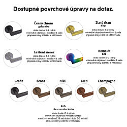 Toto dveřní kování je dostupné v provedení pro obyčejný klíč (BB), cylindrickou vložku (PZ), nebo s WC uzamykáním s ukazatelem uzamčení pro koupelnu či toaletu.