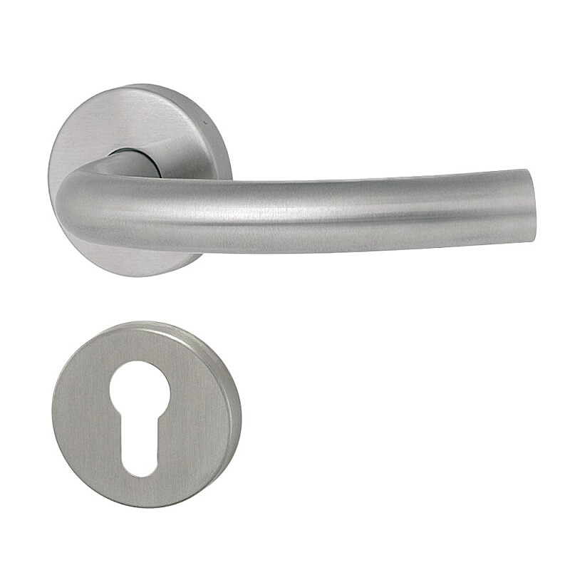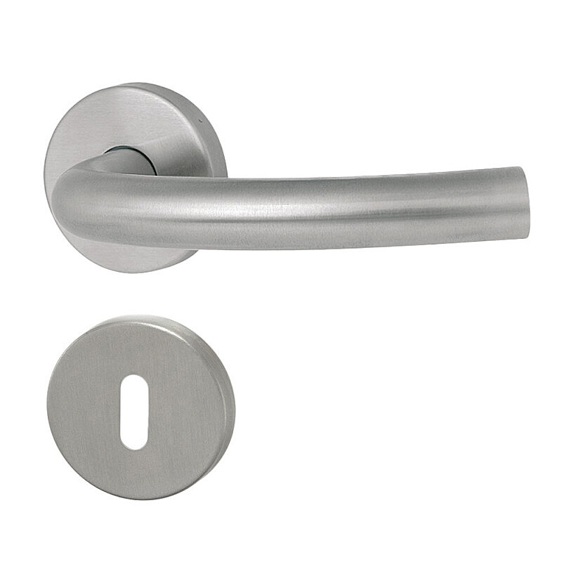 Dveřní klika MT 03 s kulatou nebo hranatou rozetou je vhodná k instalaci do interiéru i exteriéru, vyrobená z nerezové oceli DIN 1.4301 se satinovaným matným povrchem s moderním a nadčasovým designem, hygienicky nezávadná, s dlouhou životností.