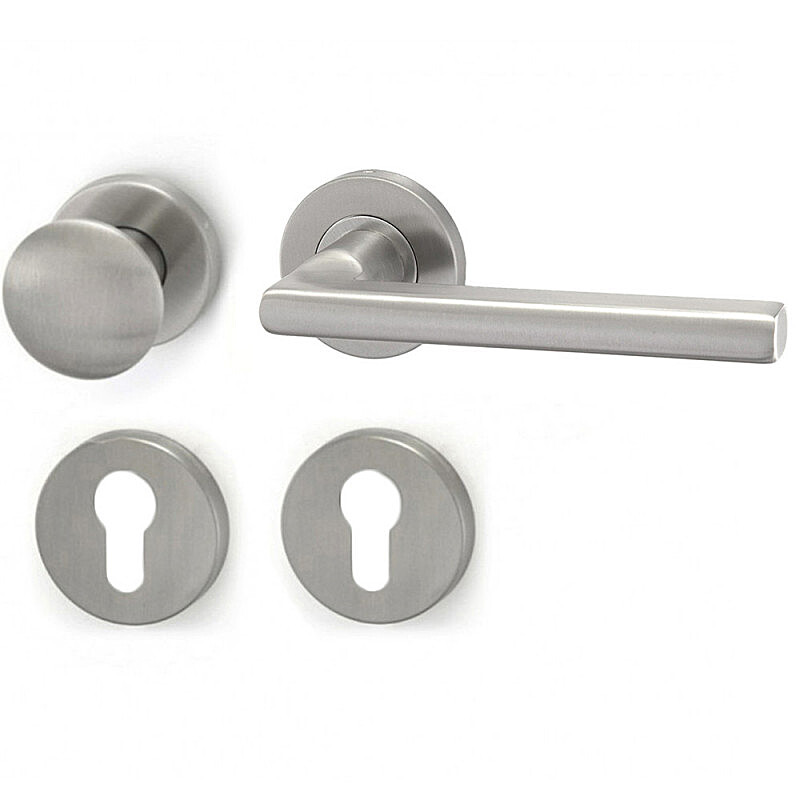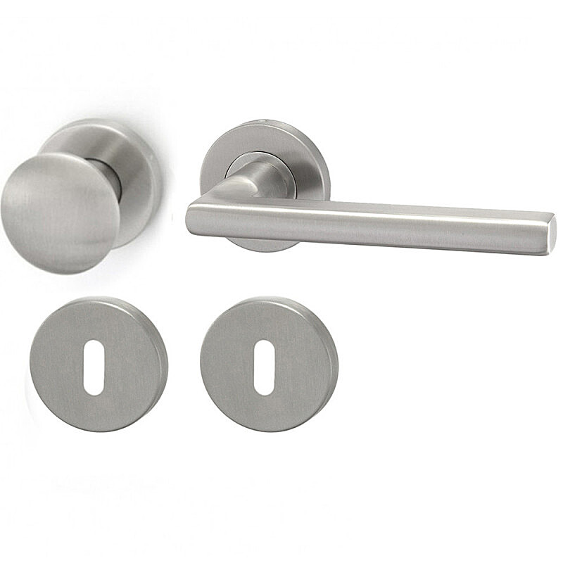 Dveřní klika MT 13 s koulí a kulatou, hranatou nebo oválnou rozetou je vhodná k instalaci do interiéru i exteriéru, vyrobená z nerezové oceli DIN 1.4301 se satinovaným matným povrchem s moderním a nadčasovým designem, hygienicky nezávadná, s dlouhou životností.