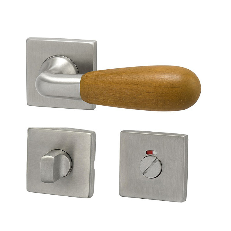 Dveřní klika WS 00 s hranatou rozetou je vhodná k instalaci do interiéru i exteriéru, vyrobená z nerezové oceli DIN 1.4301 se satinovaným matným povrchem a rukojetí z bukového dřeva s moderním a nadčasovým designem, hygienicky nezávadná, s dlouhou životností. Povrchová úprava nerezové části je realizována kartáčováním, nejsou na ni nanášeny žádné další laky, či prováděny povrchové úpravy.