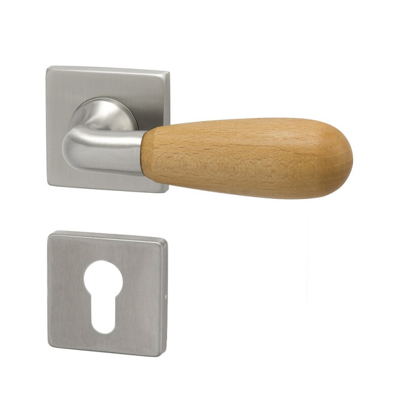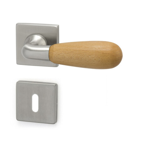Dveřní klika WS 00 s hranatou rozetou je vhodná k instalaci do interiéru i exteriéru, vyrobená z nerezové oceli DIN 1.4301 se satinovaným matným povrchem a rukojetí z bukového dřeva s moderním a nadčasovým designem, hygienicky nezávadná, s dlouhou životností. Povrchová úprava nerezové části je realizována kartáčováním, nejsou na ni nanášeny žádné další laky, či prováděny povrchové úpravy.