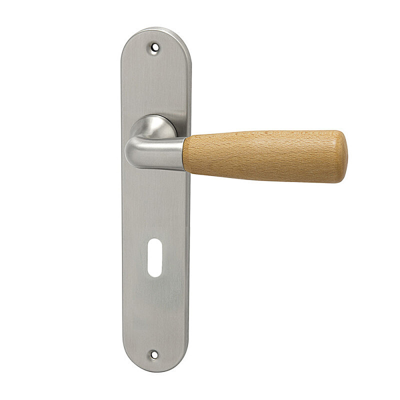 Dveřní klika WSS 01 se štítem je vhodná k instalaci do interiéru i exteriéru, vyrobená z nerezové oceli DIN 1.4301 se satinovaným matným povrchem s moderním a nadčasovým designem a rukojetí z bukového dřeva s moderním a nadčasovým designem, hygienicky nezávadná, s dlouhou životností. Povrchová úprava je realizována kartáčováním, nejsou na ni nanášeny žádné další laky, či prováděny jiné povrchové úpravy. Je odolná proti tzv. "prstýnkovému efektu" - poškrábání či oprýskání prstýnky nebo jinými kovovými předměty.