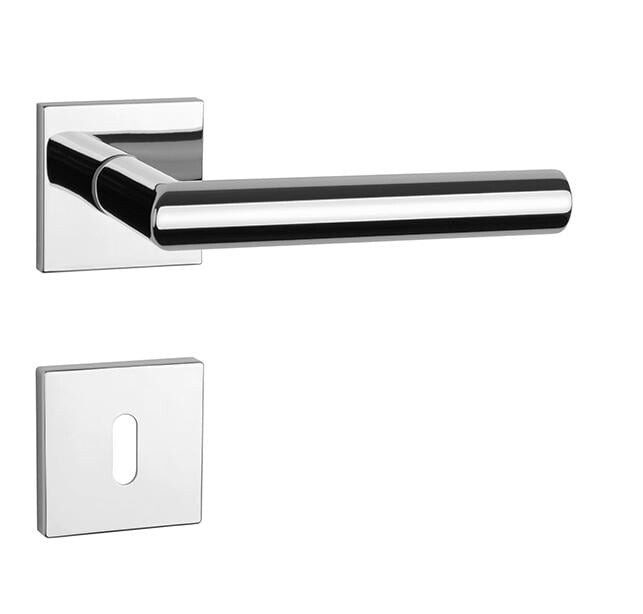 Rozetová klika na interiérové dveře s hranatou rozetou je vyrobena z materiálů vysoké kvality - zamak a je povrchově upravena. Rozeta má rozměr 52x52 mm a tloušťku jen 7 mm. Minimalistický design rozety s vysokou stabilitou kliky na dveřích působí jemně, a tím ponechává prostor pro vyniknutí designu samotné kliky.