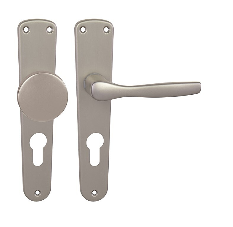Štítová klika na interiérové dveře s oválným štítem je vyrobena z hliníku a je povrchově upravena. Oválný štít má rozměry 42 mm x 206 mm a klika neobsahuje vratný mechanismus.