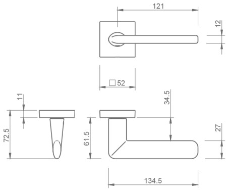 Rozetová klika na interiérové dveře s hranatou rozetou je vyrobena z materiálů vysoké kvality - zamak a je povrchově upravena. Rozeta má rozměry 52 mm x 52 mm a standardní tloušťku 11 mm.