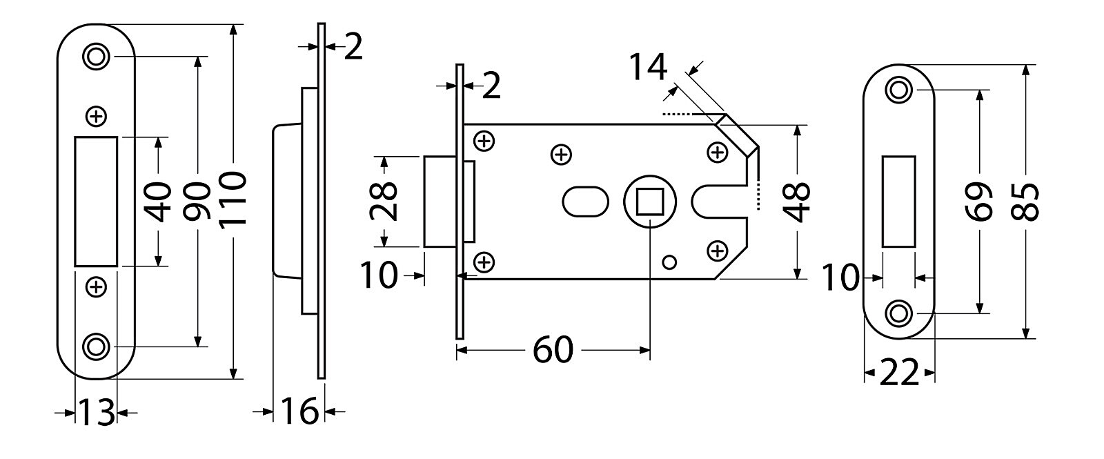 Magnetický zadlabací zámek RICHTER pro kování bez spodních rozet EN.305.M.KL.60.22.(NIMAT)