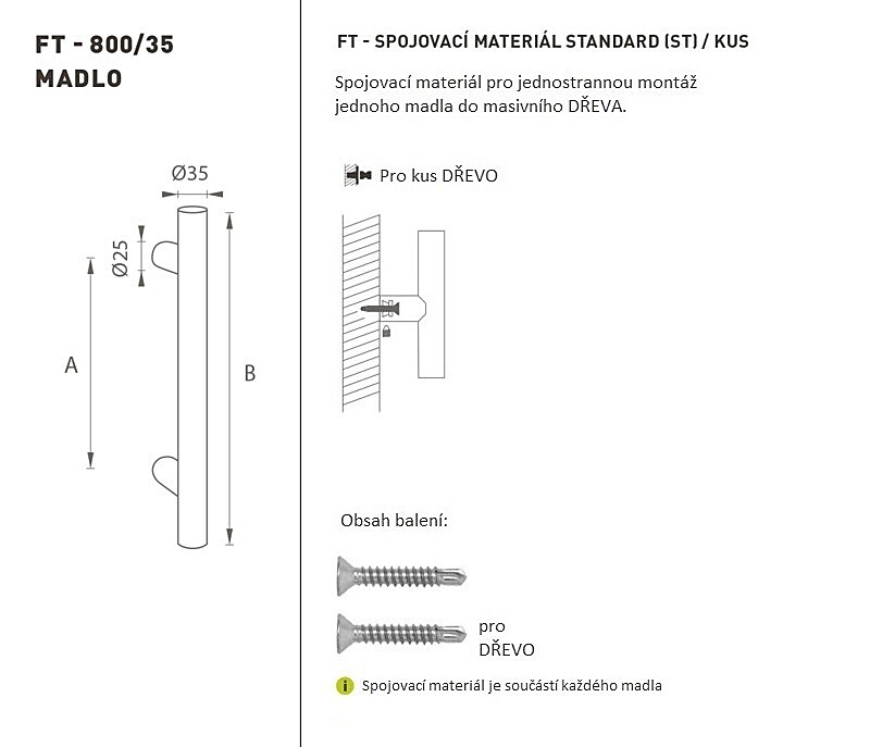 Madlo na dveře je vyrobeno z vysoce kvalitní nerezavějící oceli, známé jako nerez a je povrchově upraveno. Profil madla je 35 mm. Součástí madla jsou vruty 6x 45 mm.