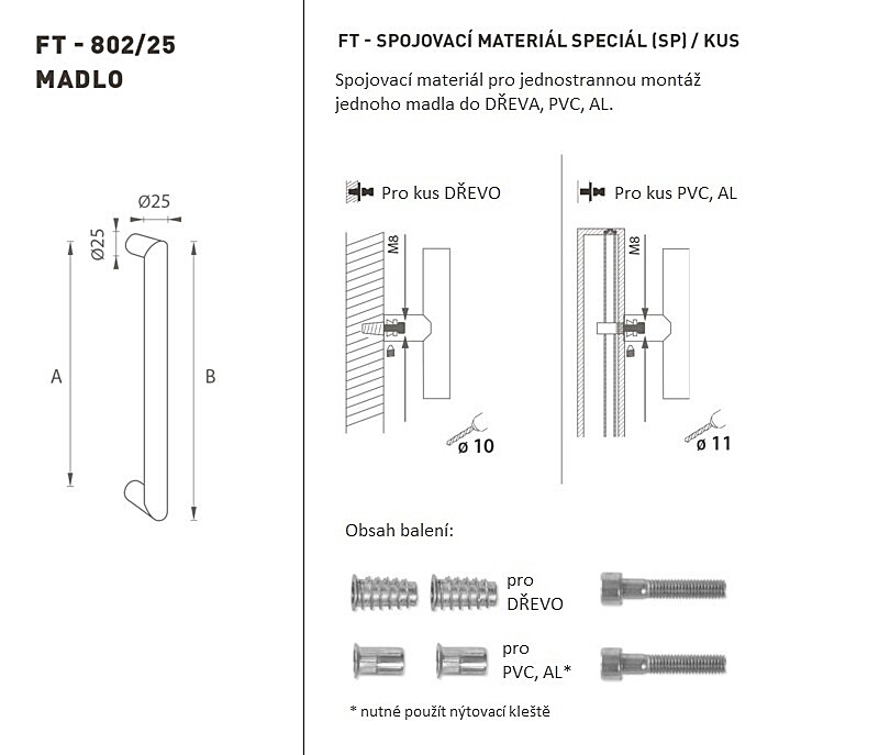 Madlo na dveře je vyrobeno z vysoce kvalitní nerezavějící oceli, známé jako nerez a je povrchově upraveno. Profil madla je 25 mm. Sada SPECIÁL (SP) obsahuje spojovací materiál pro jednostrannou montáž jednoho madla do dřeva, PVC, AL.