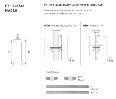 Madlo na dveře je vyrobeno z vysoce kvalitní nerezavějící oceli, známé jako nerez a je povrchově upravené. Profil madla je 32 mm. Sada UNIVERZÁL (UN) obsahuje spojovací materiál pro oboustrannou montáž dvou madel do dřeva, PVC, AL, skla.