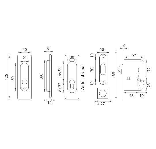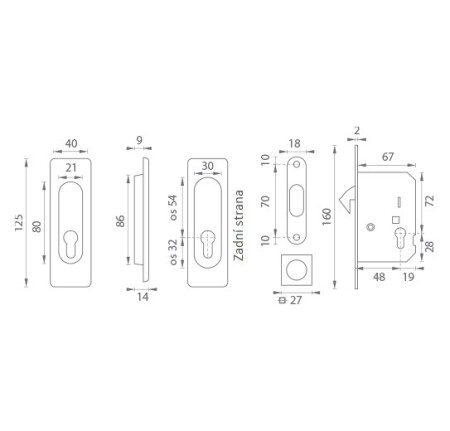 Hranatý set na posuvné dveře s otvorem pro cylindrickou vložku (PZ).