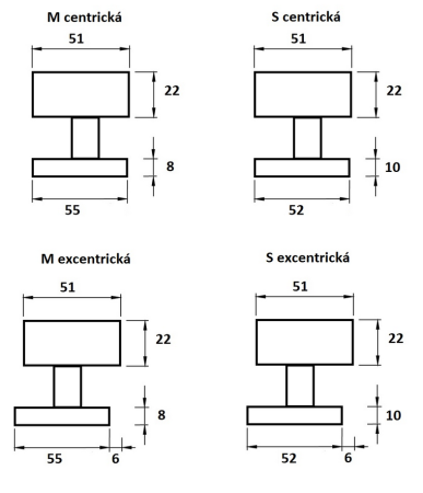 Typ rozety - liší se v rozměrech (průměr nebo délka hrany x výška) a v případě stávající kliky se vybírá podle její rozety (v názvu kování je obsaženo "M" nebo "S"):