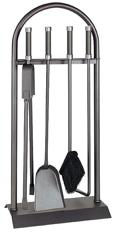 Antracitové krbové nářadí s chromovými koncovkami ruček obsahuje kleště, pohrabáč, smetáček a lopatku.