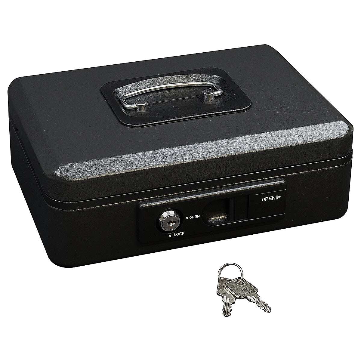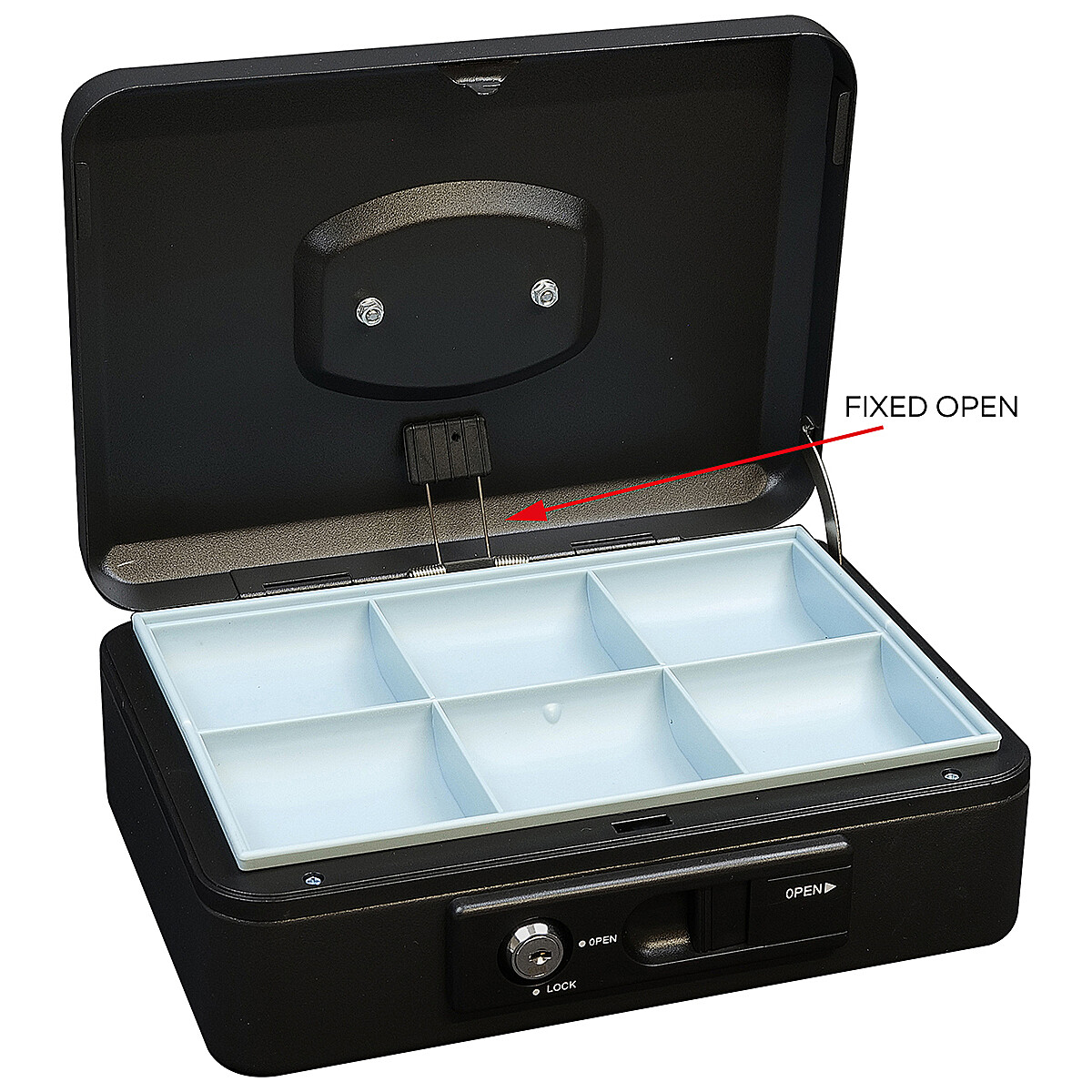 Pokladnička z oceli je vybavena vnější páčkou pro pohodlné automatické otevření víka. Po uzavření se víko automaticky aretuje, což umožňuje bezpečné přenášení, bez nutnosti uzamčení klíčem.
