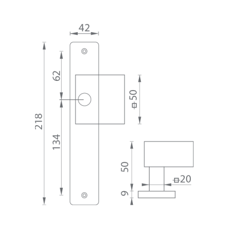 Dveřní pevné vyosené madlo na hranatém štíte je vyrobené z vysoce kvalitní nerezavějící oceli, známé jako nerez a je povrchově upravené. Madlo má rozměry 50 mm x 50 mm a hranatý štít má rozměry 42 mm x 218 mm. Madlo použité u klik QUADRA - SH v provedení madlo/klika. Příplatek za madlo použité u ostatních klik na hranatém štítě (SH).