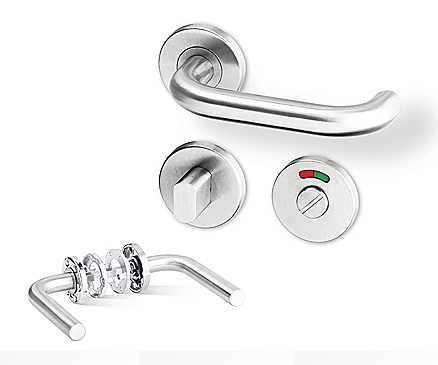 Kovová rozeta s odolnou spodní konstrukcí s trny proti pootočení, s pevným usazením krčku kliky v samostatné konstrukci rozety včetně výkonné vratné pružiny. Rozety jsou prošroubované skrz dveře pomocí metrických šroubů.