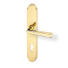 Mosazné ochranné kování s vyztuženým předním štítkem a ochrannými prvky. Zapuštěné šrouby pro sešroubování celého kování skrz dveře zvýší bezpečnost vchodových dveří a zároveň nenaruší charakter interiérů historických budov.