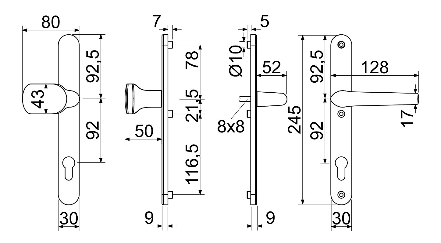 • RHD.005 - 72–92 mm - po zkrácení čtyřhranu a šroubů od tloušťky dveří 40 mm
