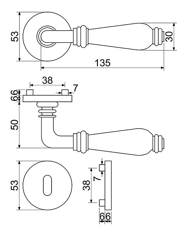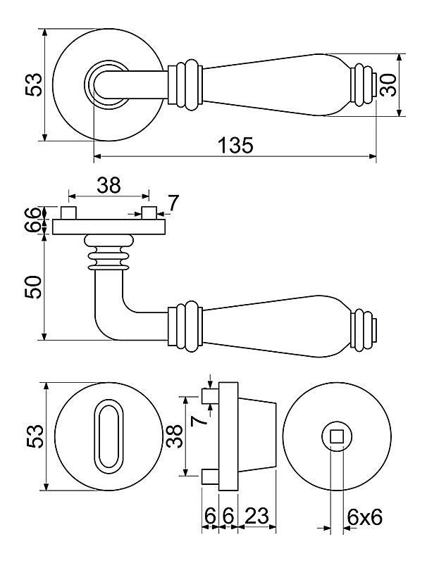 Zamakové kování na čtvercových, kulatých a obdélníkových rozetách s vratnou pružinou klik