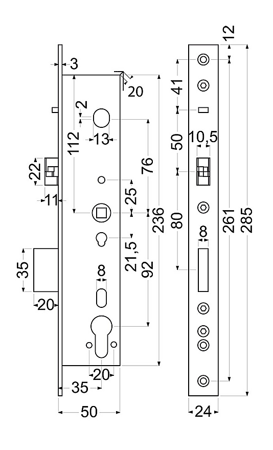- Čelo: 24 mm v matném nerezu. Backset: 35 mm
