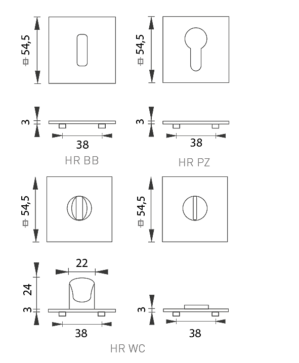 oválný otvor pro interiérový klíč (BB), otvor pro cylindrickou vložku (PZ) nebo WC set s vmontovaným klíčem. Balení obsahuje 2 kusy rozet (pár) a rozety WC jsou v balení jako set.