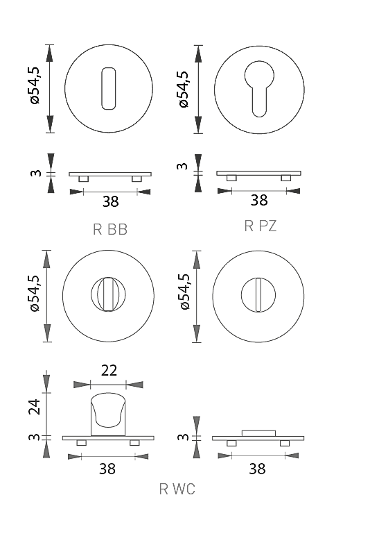 oválný otvor pro interiérový klíč (BB), otvor pro cylindrickou vložku (PZ) nebo WC set s vmontovaným klíčem.