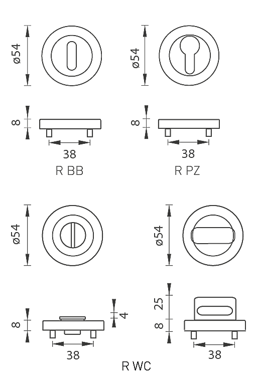 oválný otvor pro interiérový klíč (BB), otvor pro cylindrickou vložku (PZ) nebo WC set s vmontovaným klíčem.