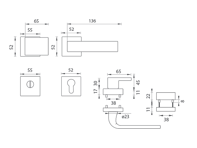 Rozetová klika na vchodové a bezpečnostní dveře s hranatou rozetou s překrytím cylindrické vložky je vyrobena z materiálů vysoké kvality - zamak / ocel a je povrchově upravena. Hranatá rozeta má rozměry 52 mm x 52 mm (resp. 55 mm x 52 mm) a tloušťku 17 mm.