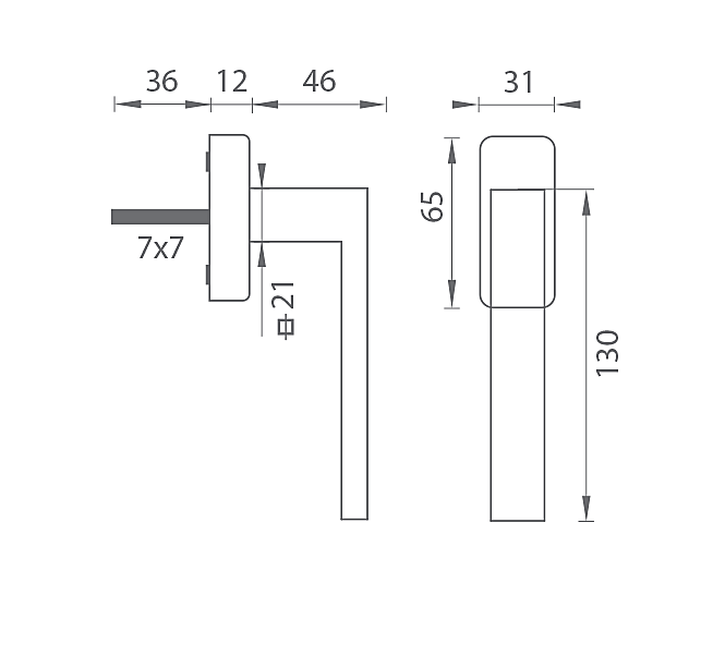 Klika na eurookno s hranatou rozetou je vyrobena z materiálů vysoké kvality - zamak a je povrchově upravena. Rozeta má rozměry 31 mm x 65 mm a tloušťku 11 mm.