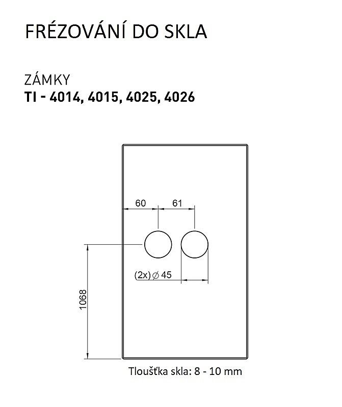 Zámek je vhodný pro skleněné dveře s tloušťkou 8 – 10 mm. Otvor pro kliku obsahuje vymezovací mechanismus pro maximální eliminování vůle čtyřhranu. Mechanismus zámku umožňuje nastavení síly pružiny a napomáhá udržování kliky v horizontální poloze.